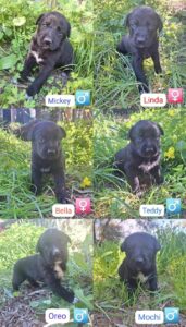 Four black puppies found in the road all rehomed in Spain, UK and Finland. Jett, Sable, Murphy and Barney.