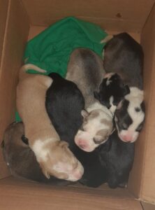 7 newborn puppies found at the bins. All rehomed in UK and France.